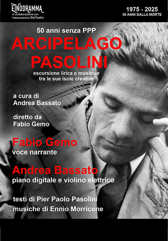 A 50 anni dalla scomparsa di Pier Paolo Pasolini (1975-2025), Etnodramma presenta una scelta di letture dell’artista di Casarsa, che spaziano a tutto tondo nel suo universo creativo. La sterminata produzione di Pasolini comporta sempre una certa difficoltà nella scelta dei materiali per raccontarlo: cosa privilegiare? Quali aspetti della sua creatività mettere in luce? Il criterio seguito per l’allestimento di questa lettura scenica e celebrativa è quello di dare conto della varietà multiforme degli interessi e della attività di Pasolini nel panorama della cultura italiana ed internazionale, pur salvaguardando una unità di stile che faccia emergere una coerenza di toni e di modi, tipici della sua personalità.
